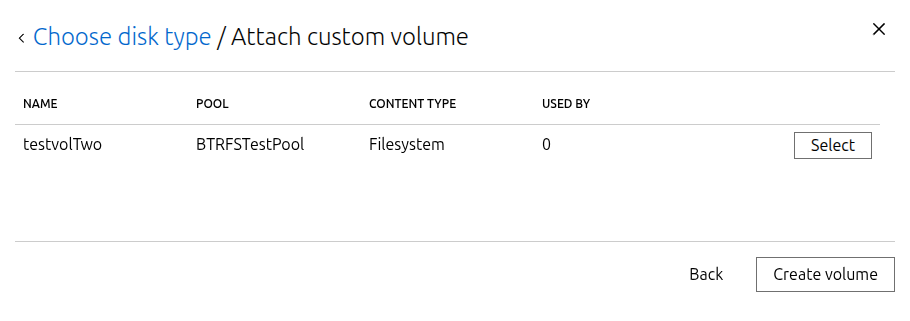 Next, you can either select a pre-existing volume to attach to the instance by clicking its corresponding Select button, or create a new custom volume by clicking Create volume: